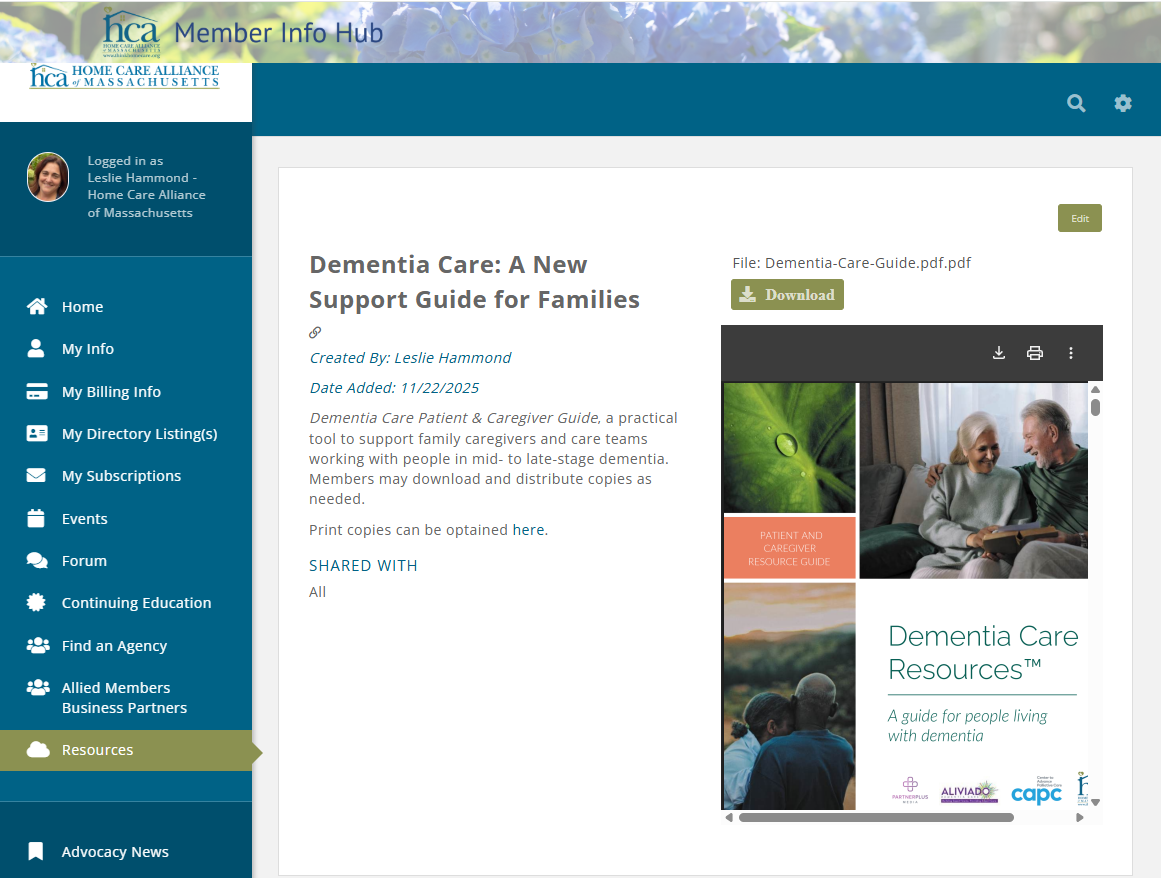 Dementia Care Patient & Caregiver Guide, a practical tool to support family caregivers and care teams working with people in mid- to late-stage dementia. Members may download and distribute copies as needed